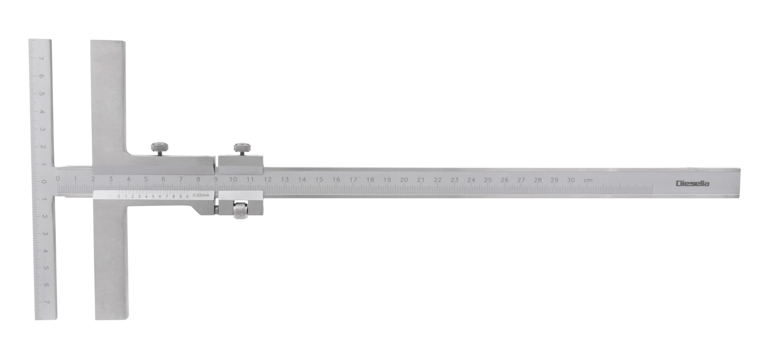 Opmærkningslære fremstillet af specialstål, hærdet og matforkromet. Med finindstilling og aflæsning 0,05 mm. Anvendes bl.a. til opmærkning på plader o.lign. Leveres i kunstlæder etui.