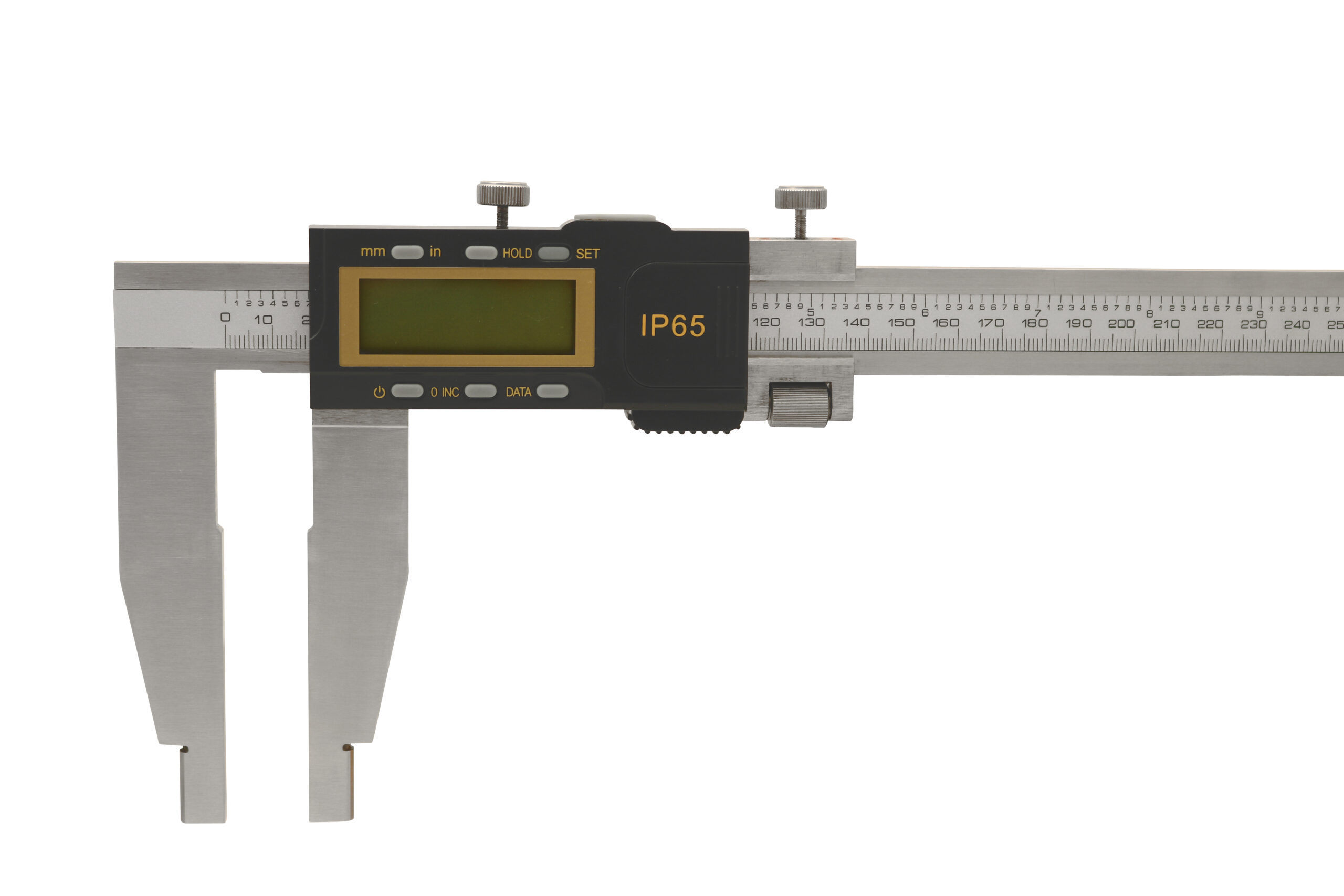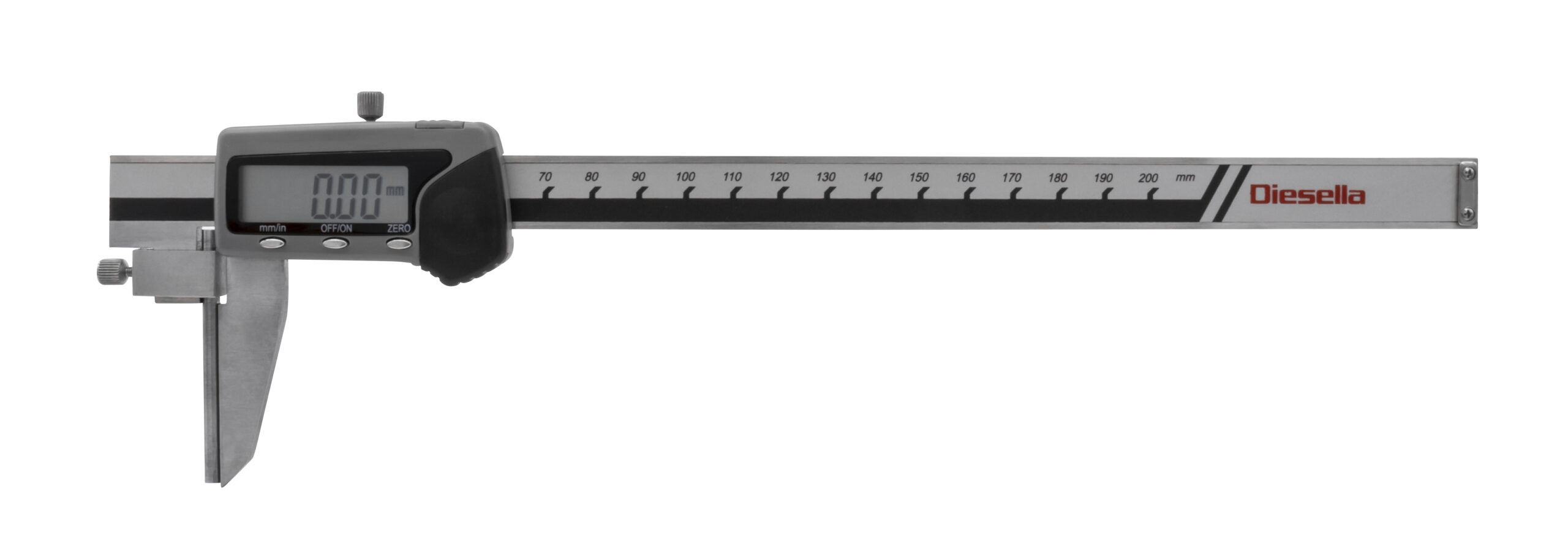 Digital skydelære med indad vinklede målespidser. Måler fra 0-200 mm med 0,01 mm aflæsning og kæbelængde på 40 mm. Manuel on/off, nulstilling, omskifter mm/tommer. Leveres i en robust trækasse til opbevaring. Batteri: 1xLR44 medfølger. • Indad vinklede målespidser • Stort LCD display • Kæber er udført i hærdet, rustfrit stål