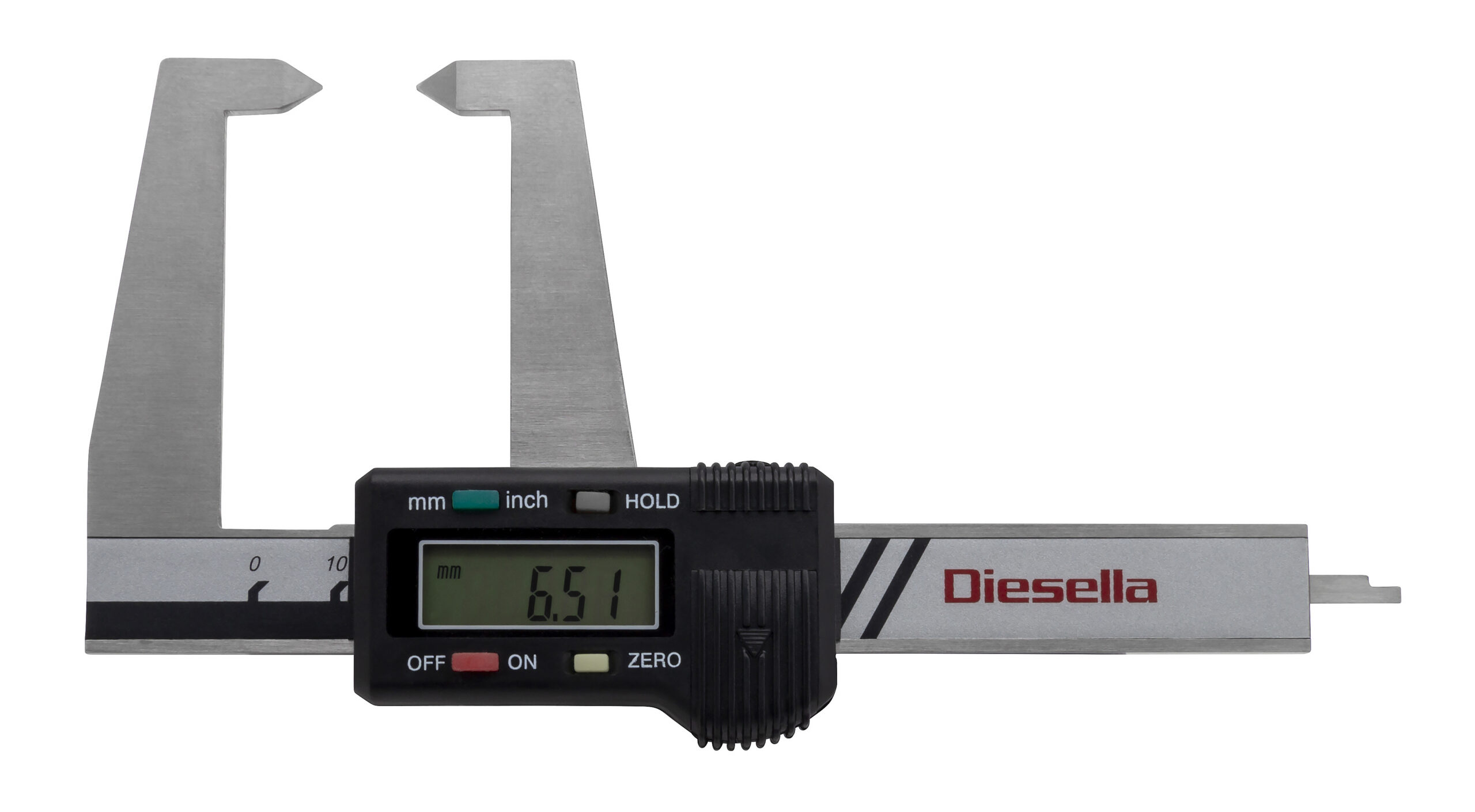 Digital skydelære med udad vinklede målespidser. Batteri: 1xLR44 medfølger. • Manuel on/off • Nulstilling • Omskifter mm/tommer