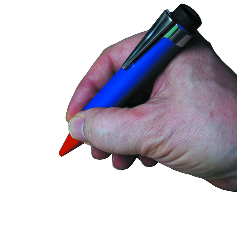 Robust, elokseret holder til JUMBO Tømrerkridt. Kridtet fremføres ved tryk på knappen i toppen. Med praktisk clips.