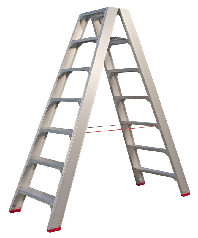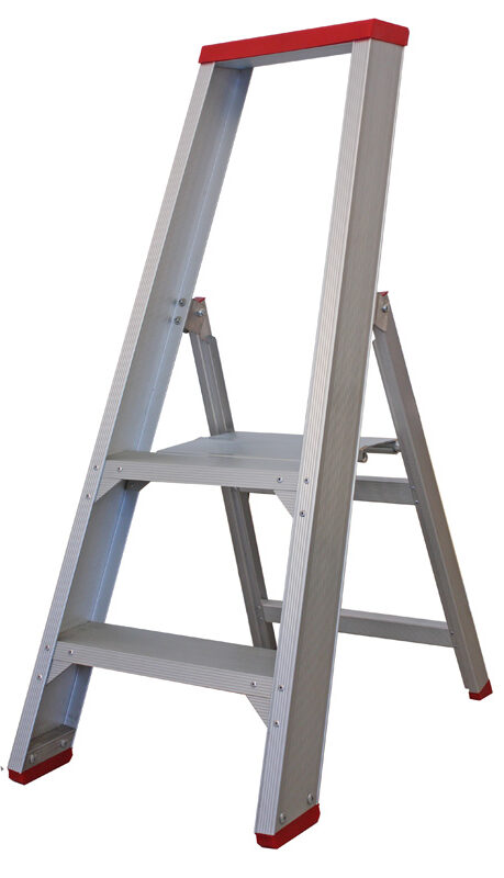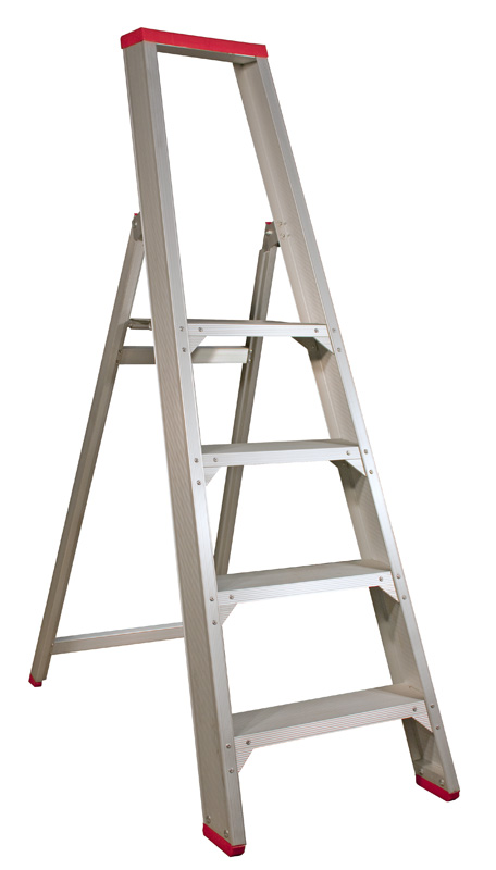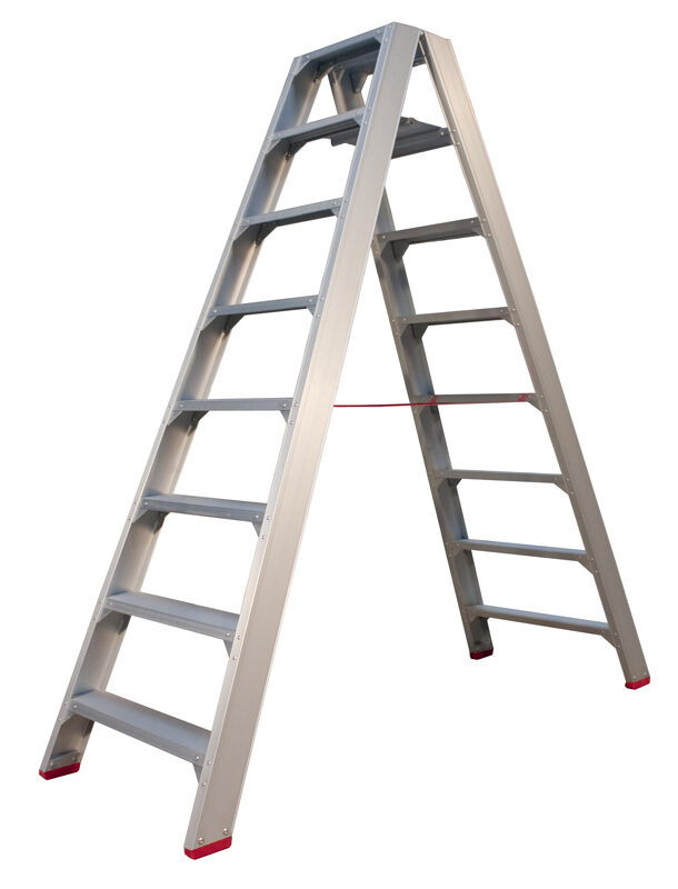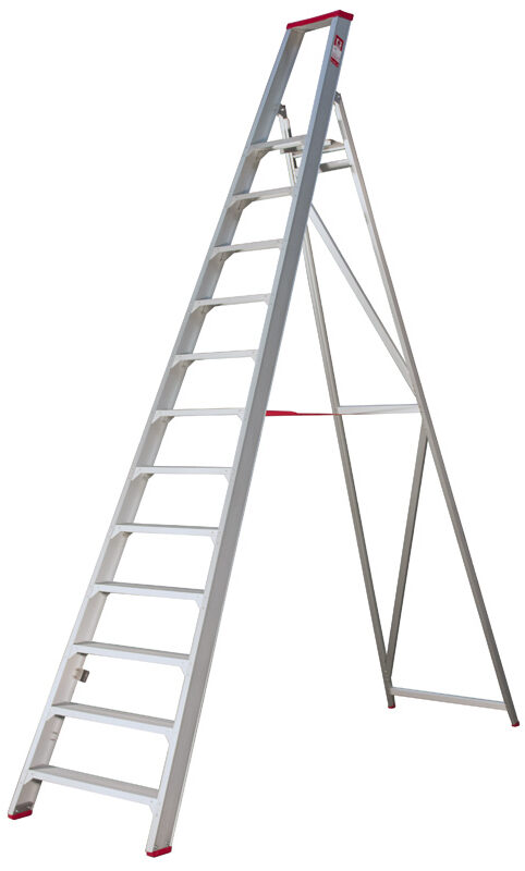 Skydestige har en selvlukkende kliklås – der giver ekstra sikkerhed og for ekstra stabilitet medfølger der også en stigefod.