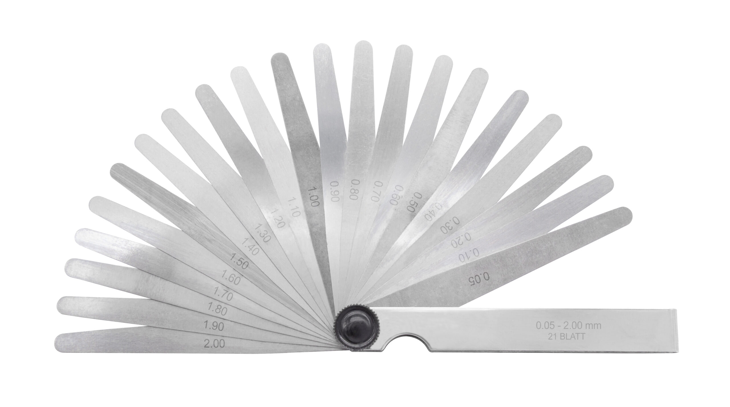 Fjederkonstante stålblade i konisk form med påskrift af tykkelse. Forniklet holder med nittet led som kan spændes. Nøjagtighed efter klasse T2.