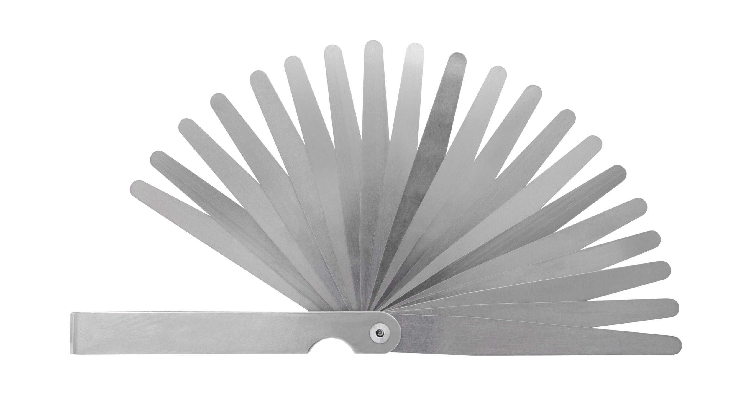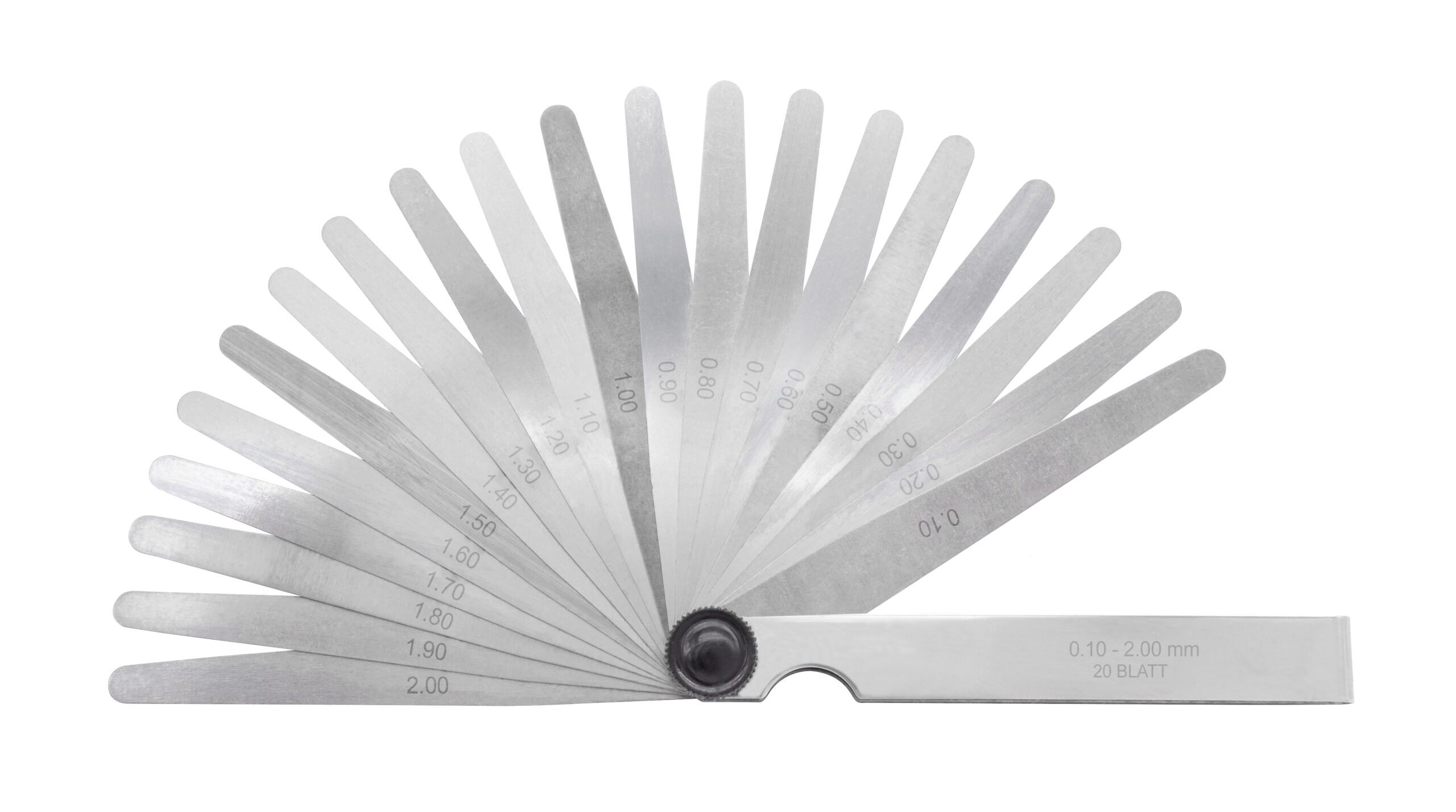 Fjederkonstante stålblade i konisk form med påskrift af tykkelse. Forniklet holder med nittet led som kan spændes. Nøjagtighed efter klasse T2.